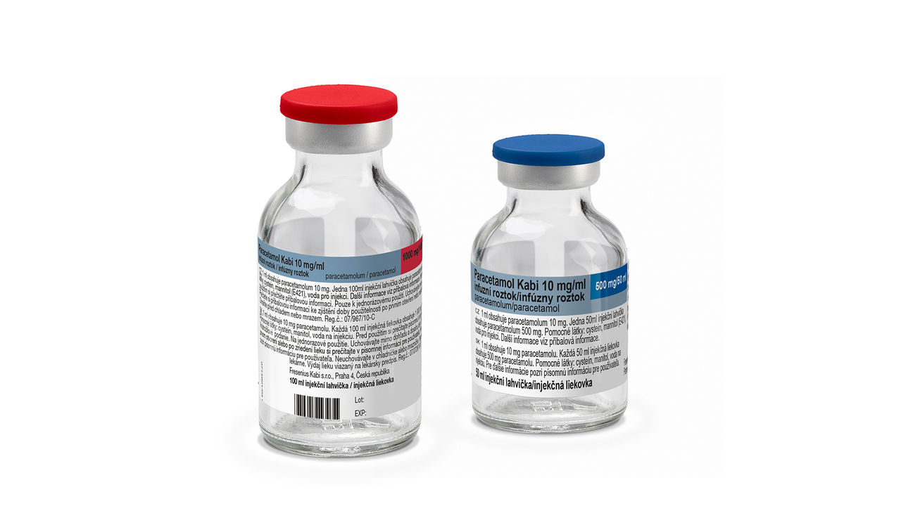 Lék Paracetamol Kabi je infuzní roztok v skleněné injekční lahvičce se závěsným uchem (z etikety léku) # indikovaný na krátkodobou léčbu horečky a středně silné bolesti, hlavně po chirurgickém zákroku.1