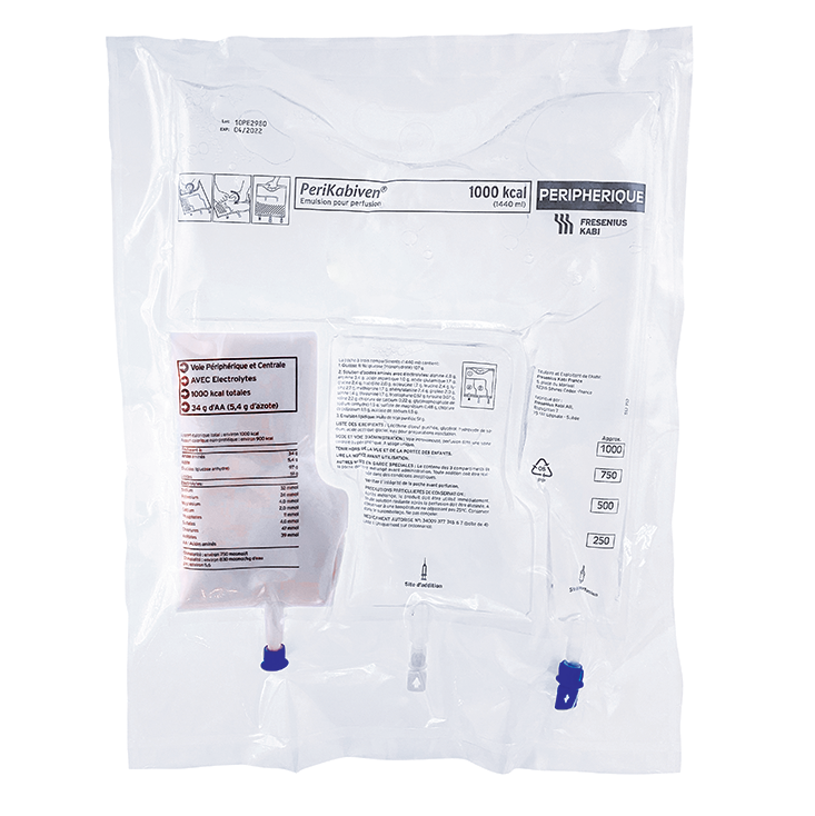 Une gamme de produits permettant d'apporter par voie intra-veineuse les nutriments nécessaires aux patients lorsque leur appareil digestif n'est pas fonctionnel. Celle-ci se compose de nutriments séparés (acides aminés, glucose, lipides, vitamines, oligoéléments) ou de mélanges en poches à deux ou trois compartiments et permet la prise en charge aussi bien des patients adultes que des patients pédiatriques.