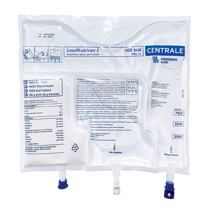 Une gamme de produits permettant d'apporter par voie intra-veineuse les nutriments nécessaires aux patients lorsque leur appareil digestif n'est pas fonctionnel. Celle-ci se compose de nutriments séparés (acides aminés, glucose, lipides, vitamines, oligoéléments) ou de mélanges en poches à deux ou trois compartiments et permet la prise en charge aussi bien des patients adultes que des patients pédiatriques.