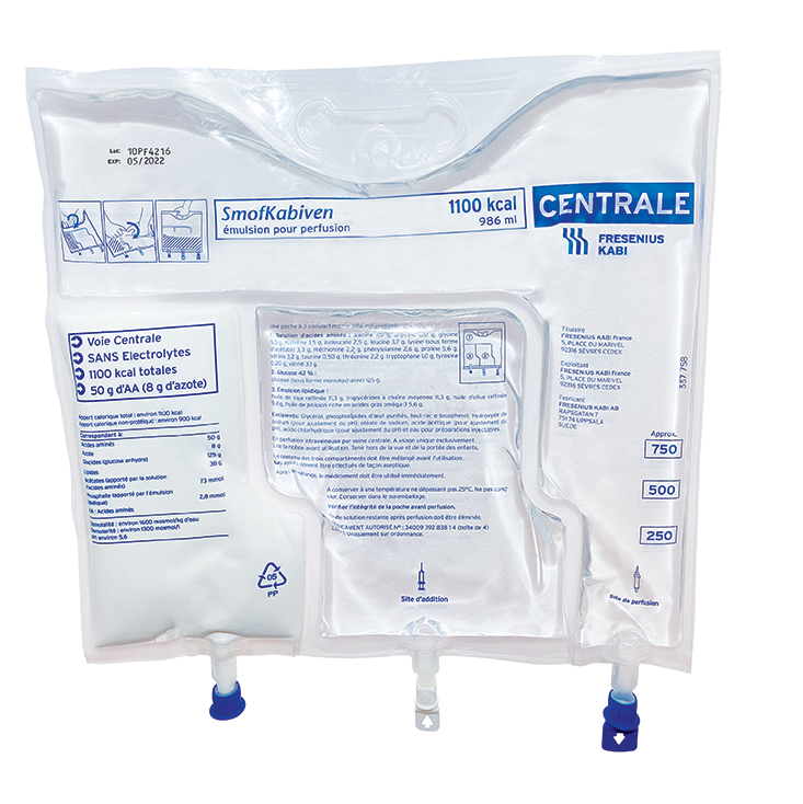 Une gamme de produits permettant d'apporter par voie intra-veineuse les nutriments nécessaires aux patients lorsque leur appareil digestif n'est pas fonctionnel. Celle-ci se compose de nutriments séparés (acides aminés, glucose, lipides, vitamines, oligoéléments) ou de mélanges en poches à deux ou trois compartiments et permet la prise en charge aussi bien des patients adultes que des patients pédiatriques.