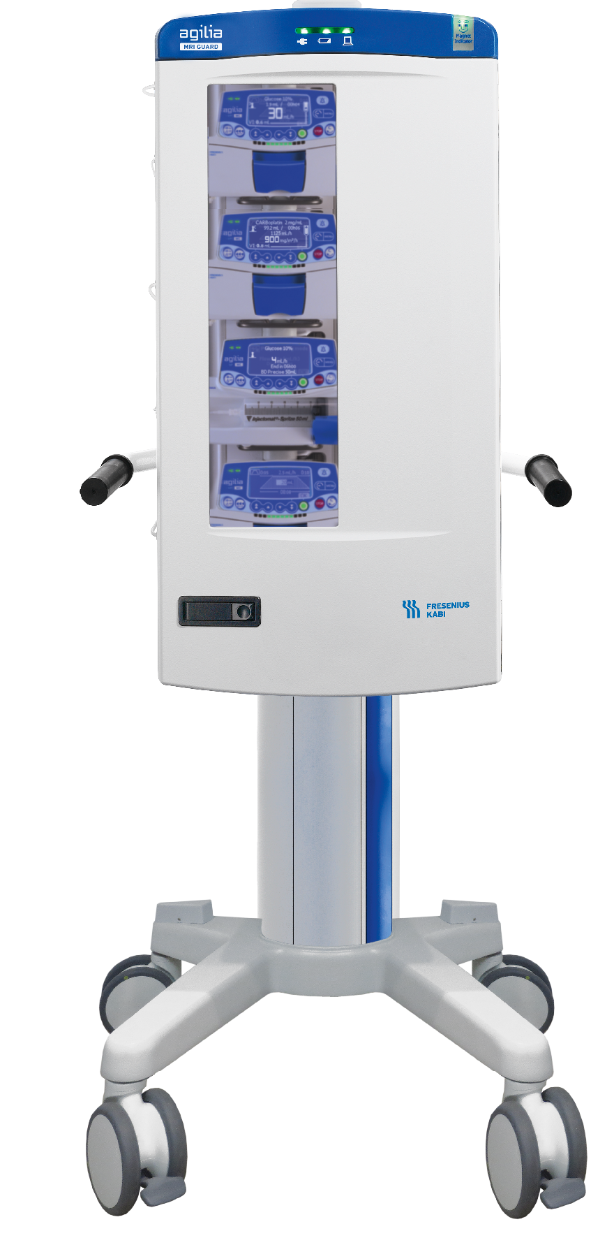 A robust, stable trolley with flexible handles allows the infusion pumps to be moved easily. Once positioned, the brakes prevent any movement of the Agilia® MRI Guard.